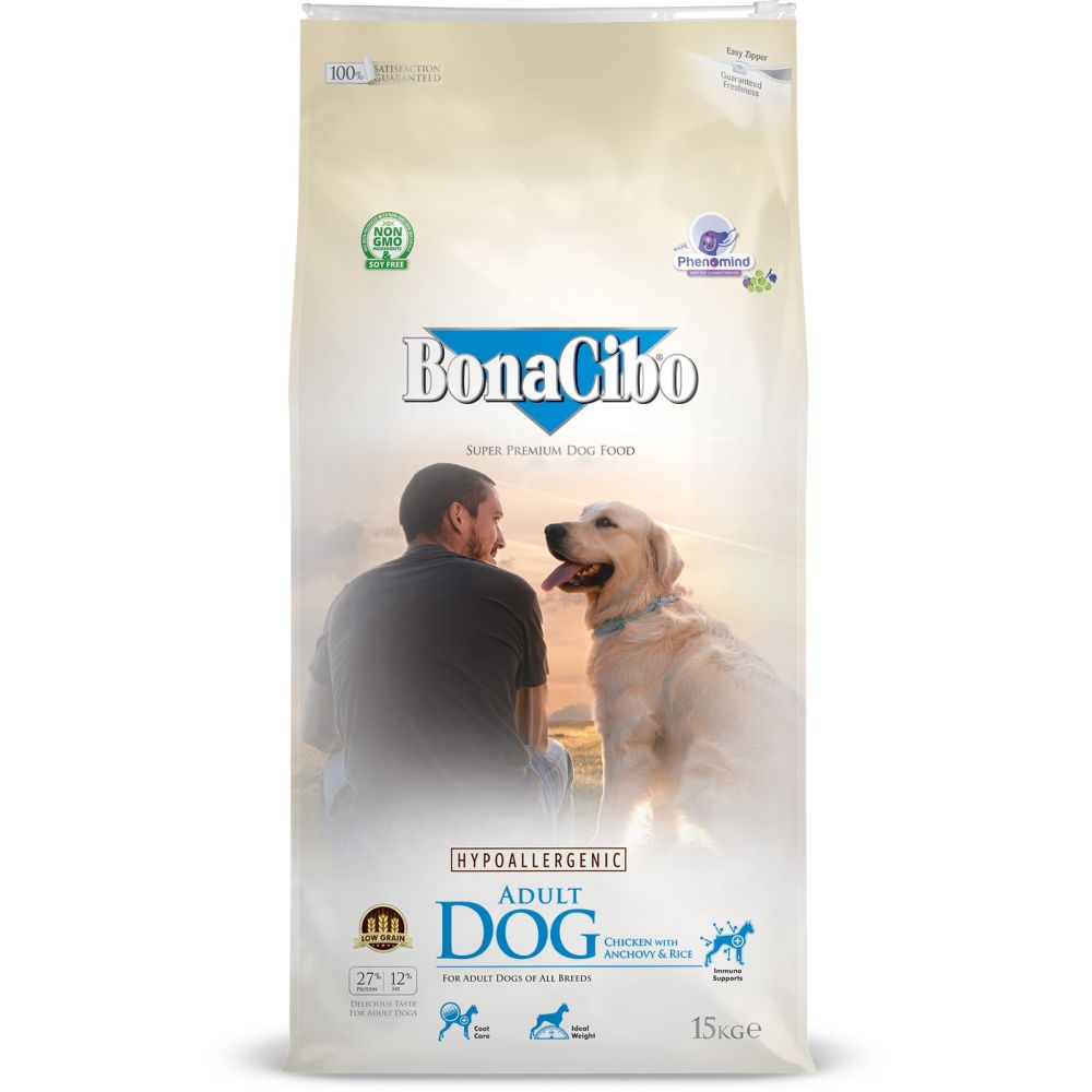 BONACIBO - Erwachsene Hunde - Huhn und Sardellen mit Reis - Trockenfutter - 15 k